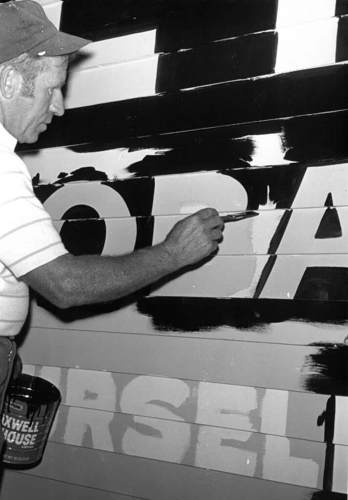 “‘Cutting in,’ the step in sign painting requiring the most skill. Warrick uses no penciled lines, only the brush, freehand style. The final step, ‘filling in,’ completes the black background of the sign.” — from GOLDENSEAL Volume 2 Issue 4