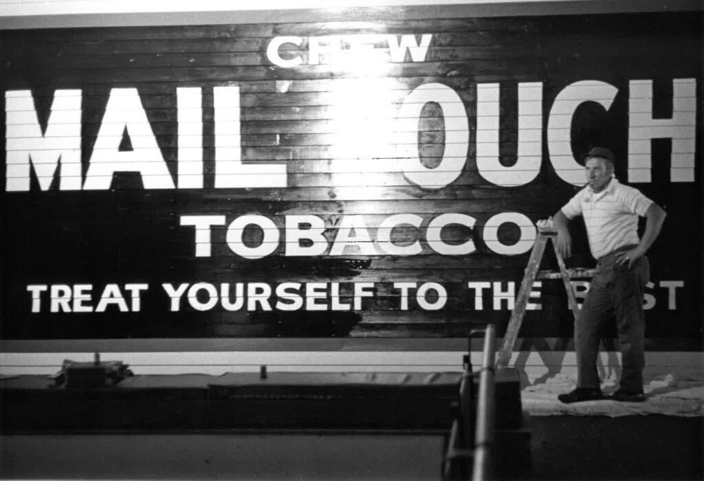 For some reason, Warrick started lettering with the “E” in the word “Chew.” Warrick’s career lasted more than a half-century. Warrick along with a partner traveled the countryside in a pickup truck. While his partner applied the black background, Warrick painted the text. The pair working in tandem could finish two barns a day. The Smithsonian Institution has exhibited Harley’s work. Of special note are his appearances on Good Morning America as well as being highlighted on a segment of On the Road with Charles Kuralt.