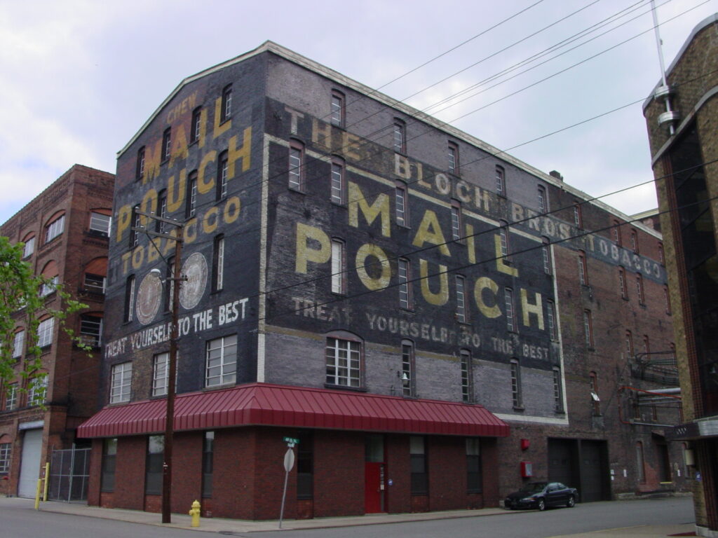 The Bloch Brothers Tobacco Company realized right off the value of advertising. Mail Pouch Tobacco advertisements on barns were first seen in the rural landscapes over a century ago. These classic examples of outdoor advertising in their vivid colors stand as a witness to the longevity of the Mail Pouch Tobacco brand. Aside from being found in Bloch Brother’s home state of West Virginia they can be found in Illinois, Iowa, Kentucky, Maryland, Michigan, Ohio, Pennsylvania, New Jersey, New York, South Carolina, Tennessee, Wisconsin, Connecticut, and some even California.