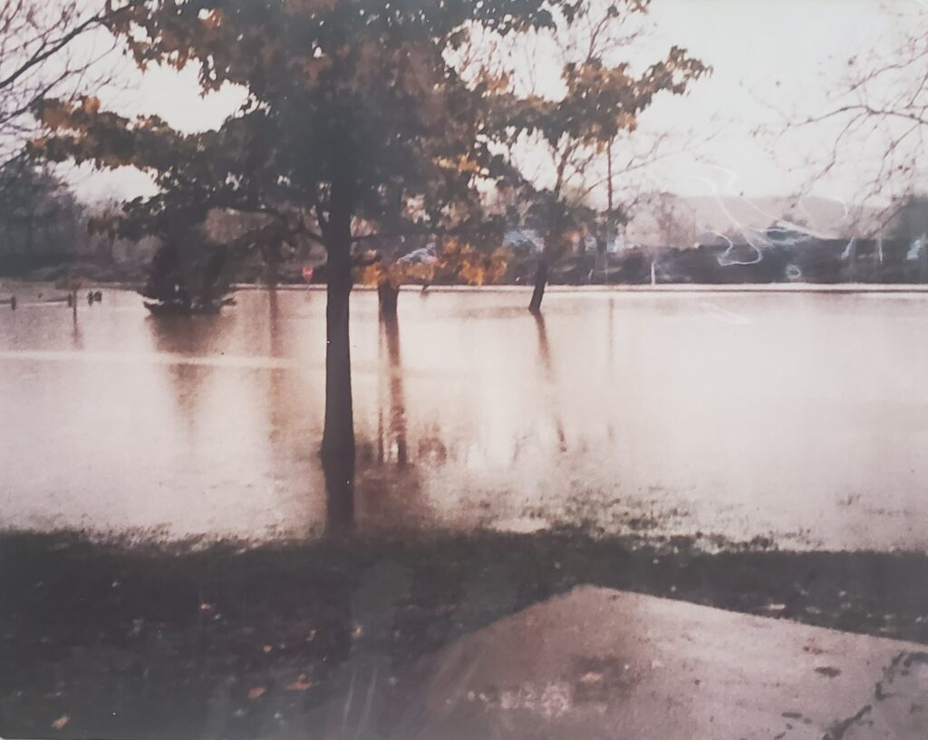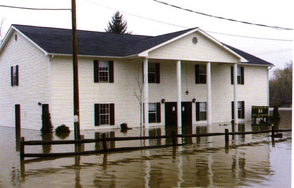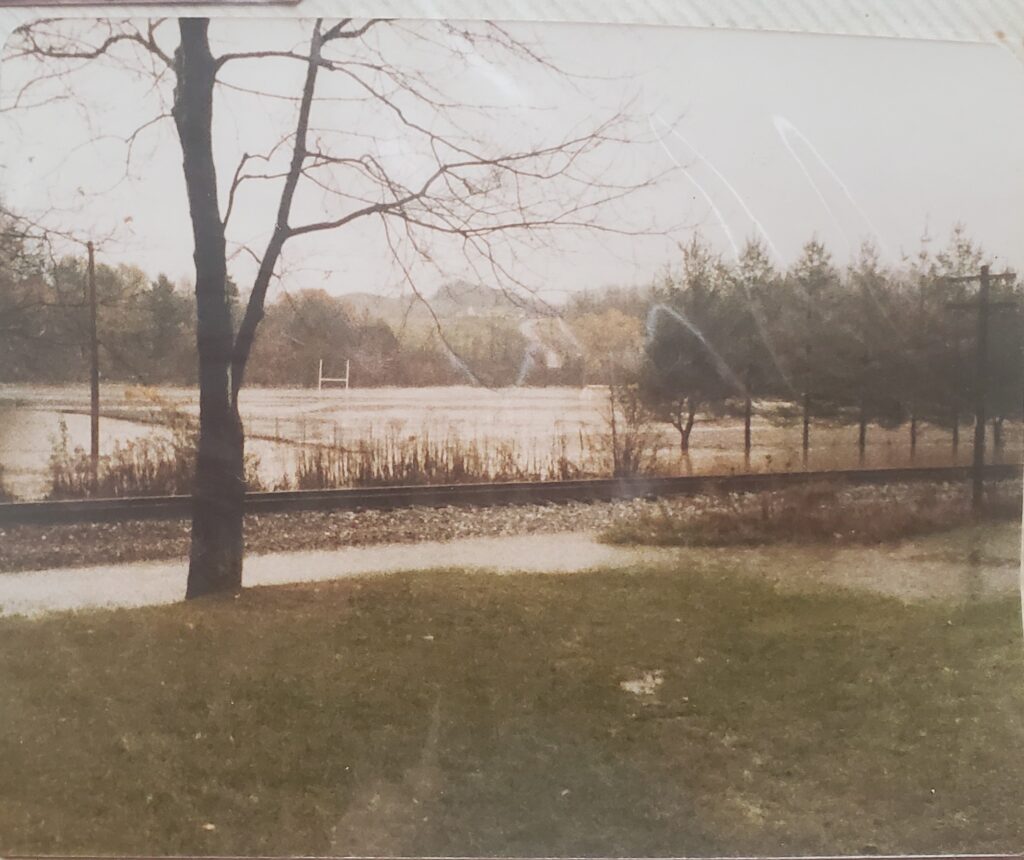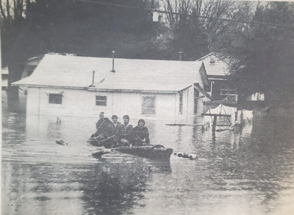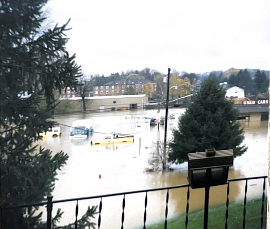Hutchinson’s prediction was correct. The Buckhannon River that winds the outskirts of campus overflowed its banks at 10 pm Monday, cresting at 30 feet (7 feet above flood level) the next morning. The water rushed into the college’s maintenance building and practice football field, closest to the river. Kirk George (Class of 1986) swears the water touched the crossbars of the goalpost.
